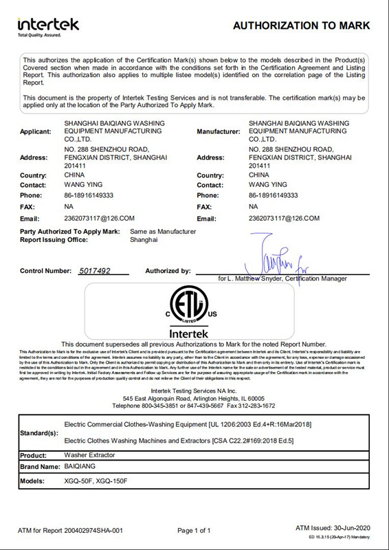 產品方面,百強洗滌設備的產品,不僅有國內的長城ISO9001質量體系認證,歐盟的CE認證,更有ETL認證。ETL是北美最具活力的安全認證標志,任何電氣、機械或機電產品只要帶有ETL檢驗標志就表明它是經過測試符合相關的業界標準。在美國大多數地區,電氣產品的批準是強制的。ETL是指ETL測試實驗室公司(ETL Testing Laboratories Inc)。ETL的列名產品是由"有司法權主管機關"(Authorities Having Jurisdiction)承認的,可認為"已批準"。要獲得ETL認證,需要你的產品經過以下四個方面的測試:
